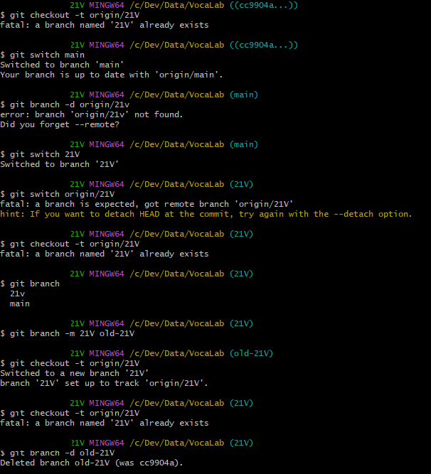 fatal: a branch named '21V' already exists: 로컬에21V라는 이름의 브랜치가 이미 있어서, 원격21V브랜치를 추적할 새 브랜치를 만들 수 없습니다.fatal: a branch is expected:git switch명령어는 로컬 브랜치만 전환할 수 있으며, 원격 브랜치를 직접 사용할 수 없습니다.